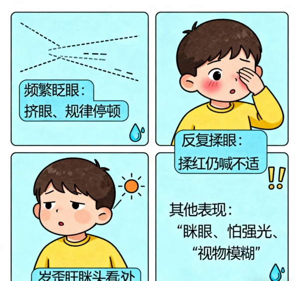 兒童干眼癥的癥狀與成年人有所不同,不會出現(xiàn)明顯的 “眼睛干澀、異物感” 等清晰表述,更多是通過行為表現(xiàn)傳遞信號。家長若發(fā)現(xiàn)孩子有以下情況,需警惕干眼癥的可能:?