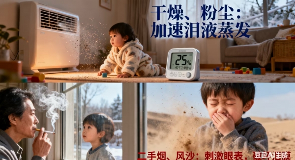 干燥的環(huán)境會加速淚液蒸發(fā),比如冬季長時間開空調(diào)、暖氣,夏季頻繁使用空調(diào),都會導致室內(nèi)空氣濕度降低(正常適宜濕度為 40%-60%,低于 30% 時淚液蒸發(fā)會明顯加快);此外,長期處于煙霧環(huán)境(如家長吸煙)、風沙較多的戶外,或長時間待在有粉塵的室內(nèi)(如未及時清潔的毛絨玩具、地毯),也會刺激眼球表面,破壞淚膜穩(wěn)定性,誘發(fā)干眼癥。?