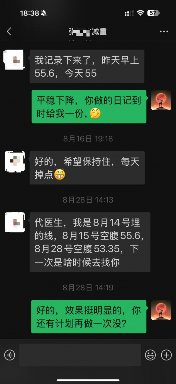 埋線后,她的體重穩(wěn)步下降:8月15日空腹體重55.6公斤,8月28日已降至53.35公斤。不到一個月,體重下降近3公斤,效果顯著。