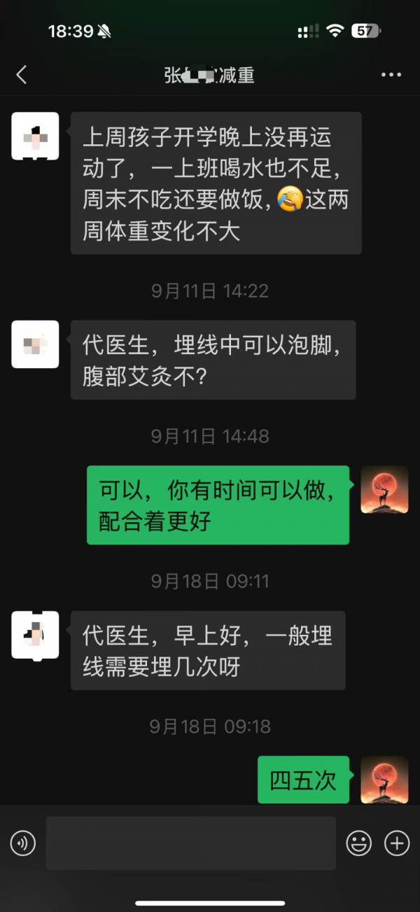 8月31日,張女士進行了第二次埋線。她反饋:“這次沒有上次疼,除了腿上三針有點感覺之外,沒有其它不適,是身體耐受了嗎?”
