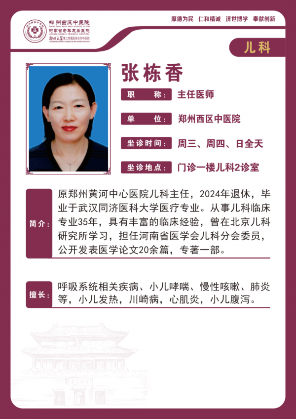 原鄭州黃河中心醫(yī)院兒科主任,2024年退休,畢業(yè)于武漢同濟(jì)醫(yī)科大學(xué)醫(yī)療專業(yè)。從事兒科臨床專業(yè)35年,具有豐富的臨床經(jīng)驗(yàn),曾在北京兒科研究所學(xué)習(xí),擔(dān)任河南省醫(yī)學(xué)會(huì)兒科分會(huì)委員,公開發(fā)表醫(yī)學(xué)論文20余篇,專著一部。