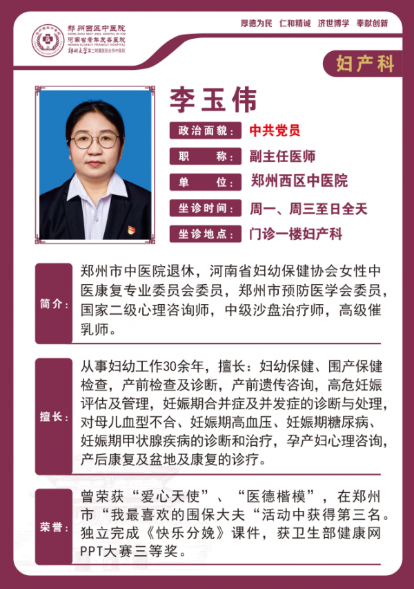鄭州市中醫(yī)院退休,河南省婦幼保健協(xié)會女性中醫(yī)康復專業(yè)委員會委員,鄭州市預防醫(yī)學會委員國家二級心理咨詢師,中級沙盤治療師,高級催乳師。